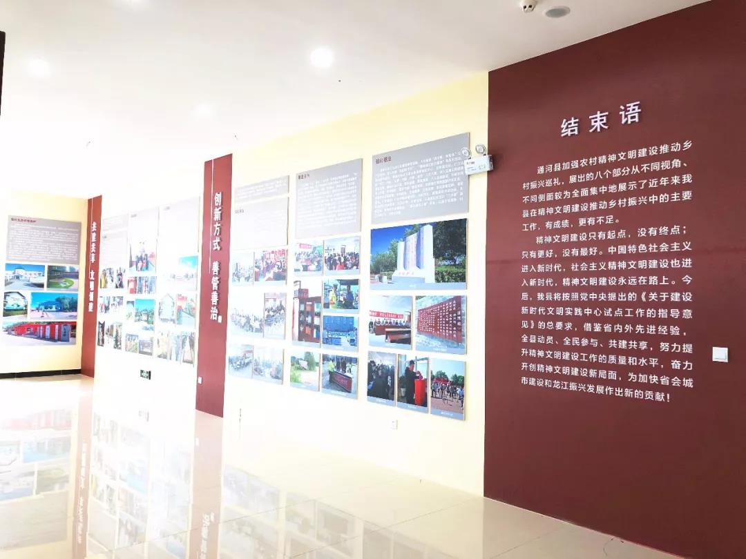 通河新时代文明实践中心展出的八个部分从不同视角、不同侧面较为全面集中地展示了近年来通河县在精神文明建设推动乡村振兴中的主要工作。