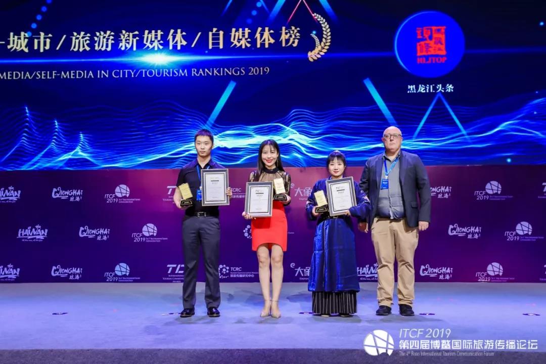 TC奖“年度媒体—城市/旅游 新媒体/自媒体榜”颁奖现场,《黑龙江头条》新媒体运营总监曲立伟上台领奖(左一)。PIC/ITCF